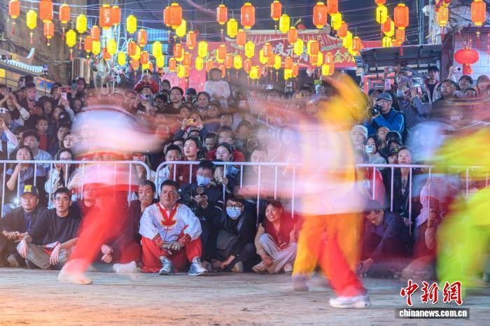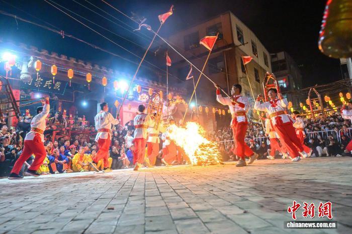 2月21日晚,福建省莆田市蒲坂村民衆舉行擺棕轎跳火鬧元宵活動。蒲坂村擺棕轎跳火鬧元宵傳承至今已有500多年曆史,火光吶喊聲中寄託着人們對新年的美好期盼。圖爲活動吸引許多市民和遊客圍觀。中新社發 蔡昊 攝