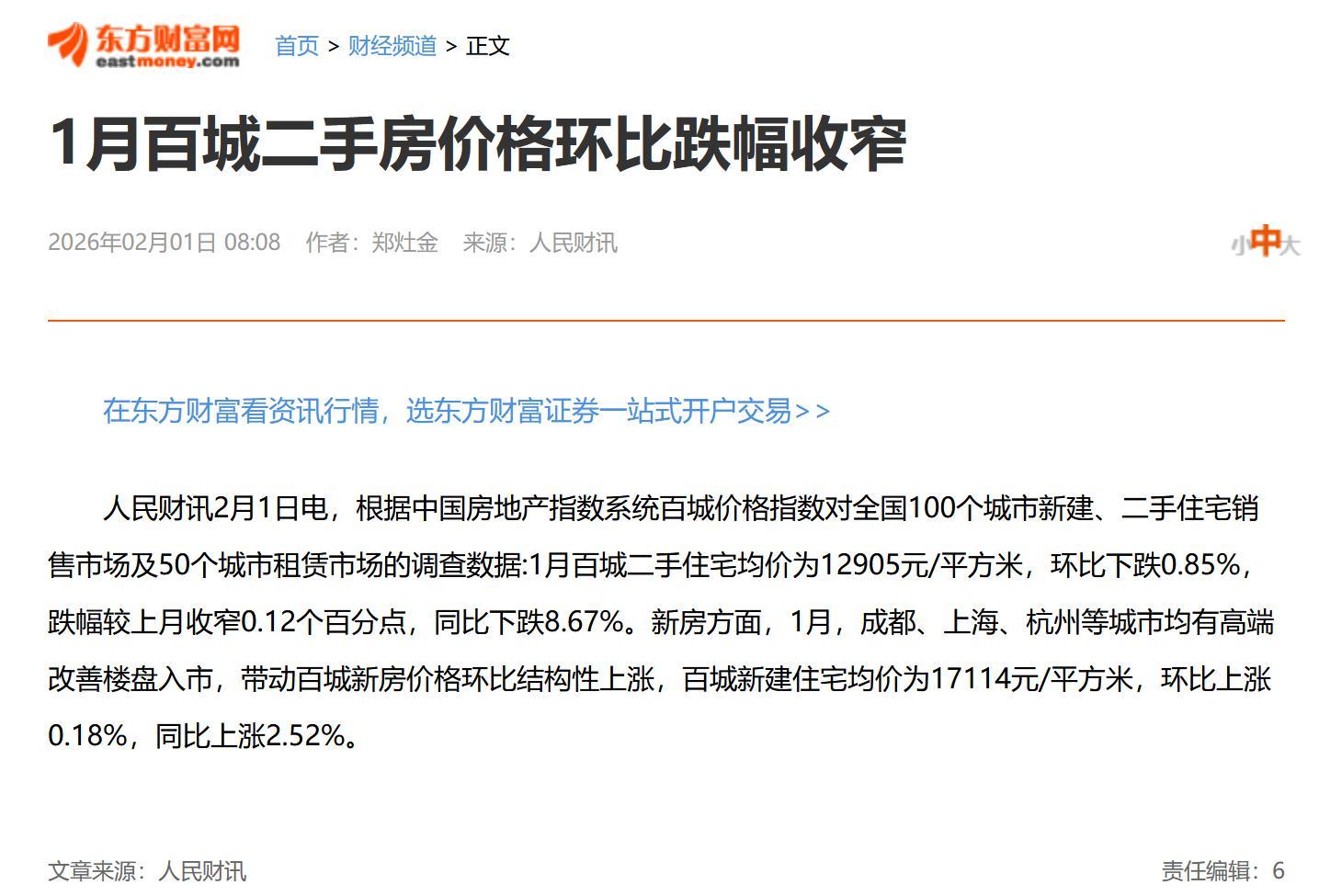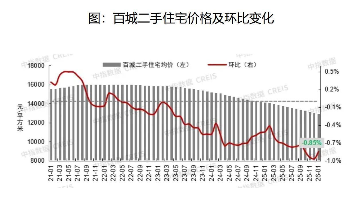 先看一組數據。中指研究院的統計顯示,百城二手房均價爲12905元每平方米,環比下跌0.85%,但跌幅比上個月收窄了0.12個百分點。國家統計局70城數據也印證了這個趨勢,二手房月環比跌幅從去年9月的0.64%收窄到了0.41%。