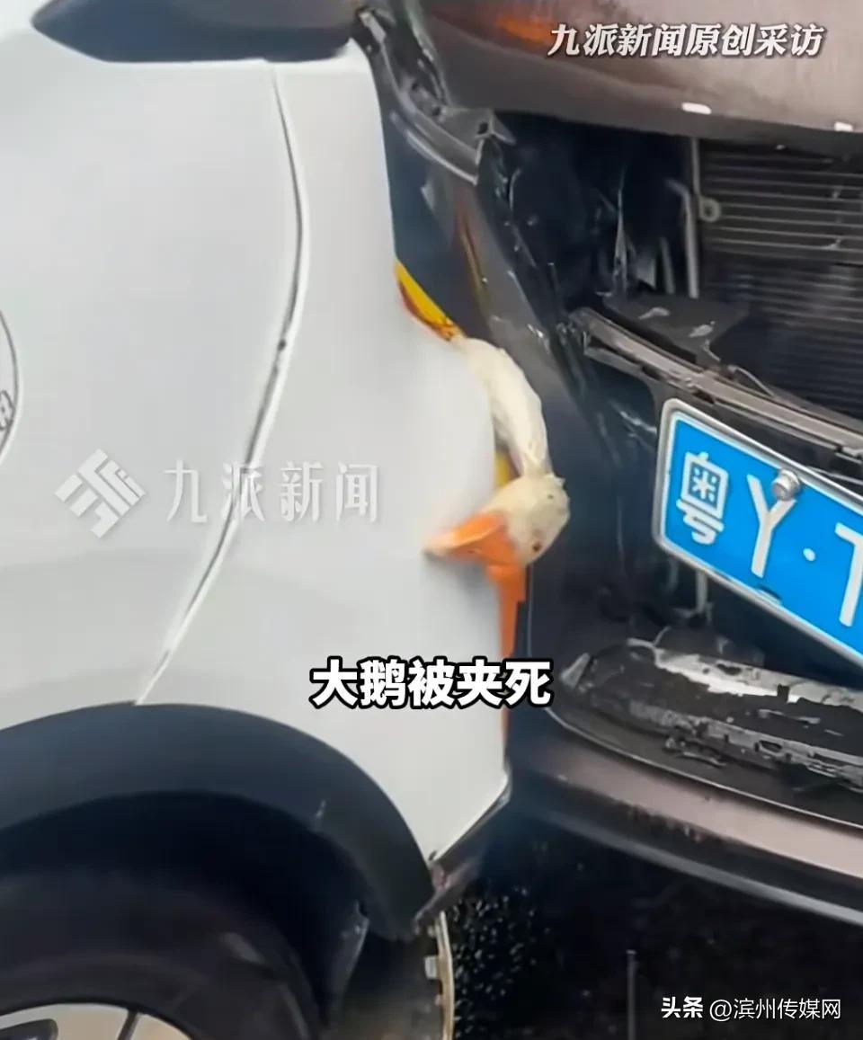 胡先生告訴@九派新聞 ,雞和鵝全死了,其中一隻鵝剛好夾在兩車之間,後車車主下來後靜靜地看了半天。不想浪費父母的心意,胡先生把鵝帶回家喫了。