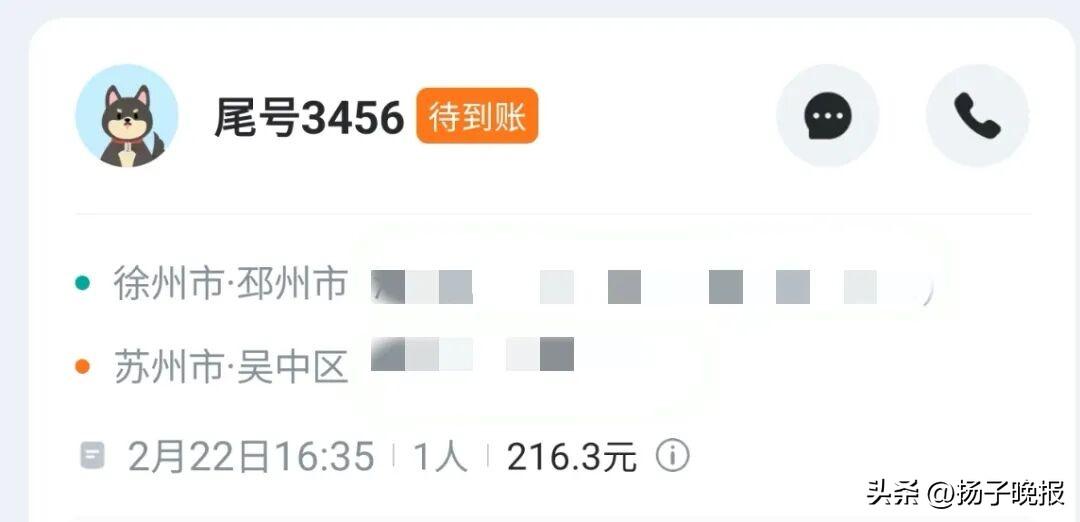 侯先生提供的訂單信息顯示,該乘客於22日16:35在邳州市上車,23日早上6:01到達目的地蘇州吳中區某產業園。