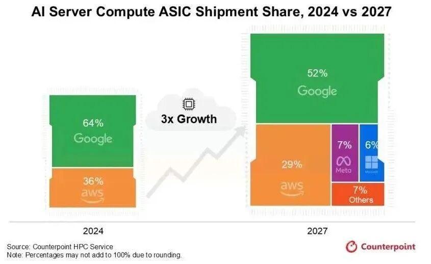 據Counterpoint Researc的預測,全球十大廠商ASIC服務器出貨量預計將在2024年至2027年間增至三倍。