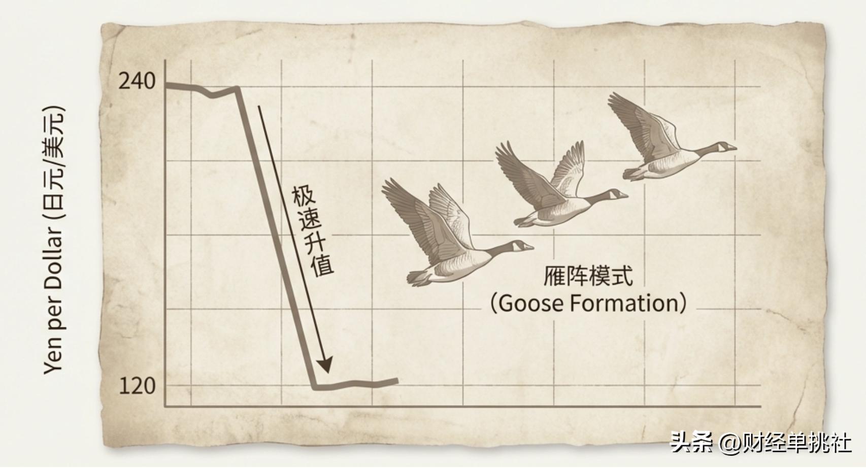 在這個極速升值的過程中,日元的購買力翻倍,這帶來了強勁的海外投資熱潮。但由於升值速度過快,其弊端遠遠大於利好。日本國內的出口企業因爲產品在海外突然變得極其昂貴,出口受到嚴重限制。爲了應對國內生存空間的壓縮,日本企業被迫大量向海外轉移產能,到東南亞等地大規模建廠。這就形成了經濟學上著名的“雁陣模式”,即日本作爲“領頭雁”掌握高端技術,將低端製造轉移到其他亞洲國家。
