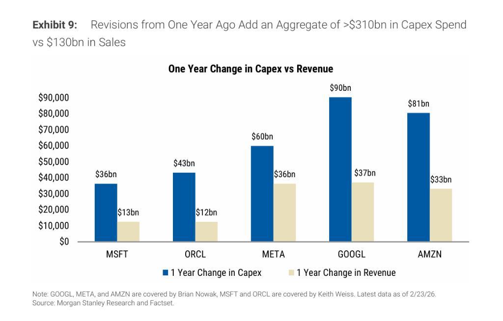 與資本支出預期的急速上修形成鮮明對比,收入修訂幾乎原地踏步,FCF預期則隨之下滑。報告數據顯示,在過去一年的2026年預測中,五家公司資本支出合計上調超3100億美元,而收入修訂合計僅約1300億美元。摩根士丹利指出,隨着固定成本基礎不斷擴大,這些公司的運營槓桿將隨之上升,未來盈利和FCF對收入預期變化的敏感度也將顯著增加。