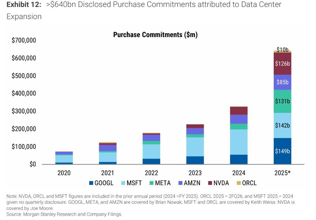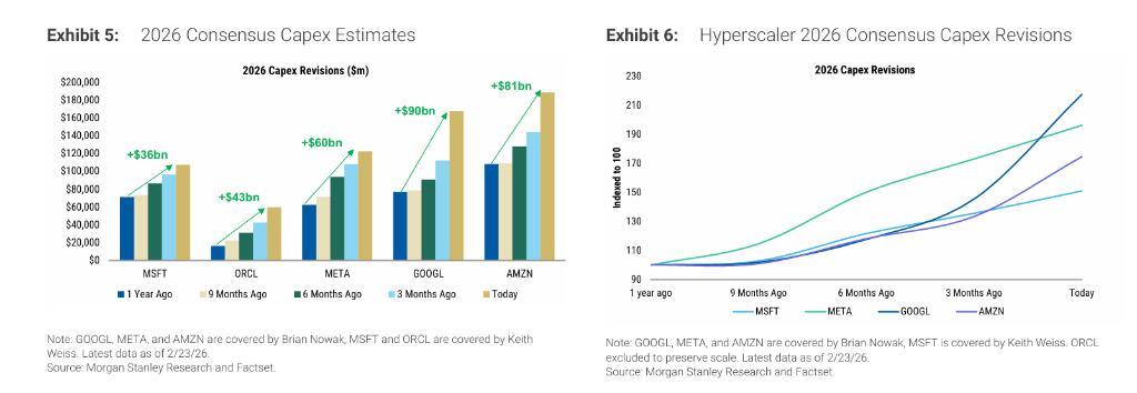 從單個公司來看,谷歌 2026年資本支出的一致性預期較一年前上調117%,META上調96%,亞馬遜上調75%,甲骨文的修訂幅度更高達264%。摩根士丹利分析師Todd Castagno團隊指出,這些修訂呈現"階躍式"特徵,而非漸進式調整,表明本輪投資週期極難預測——管理層持續更新數據中心擴建計劃,各公司爭相鎖定關鍵供應鏈,進一步加大了預測難度。