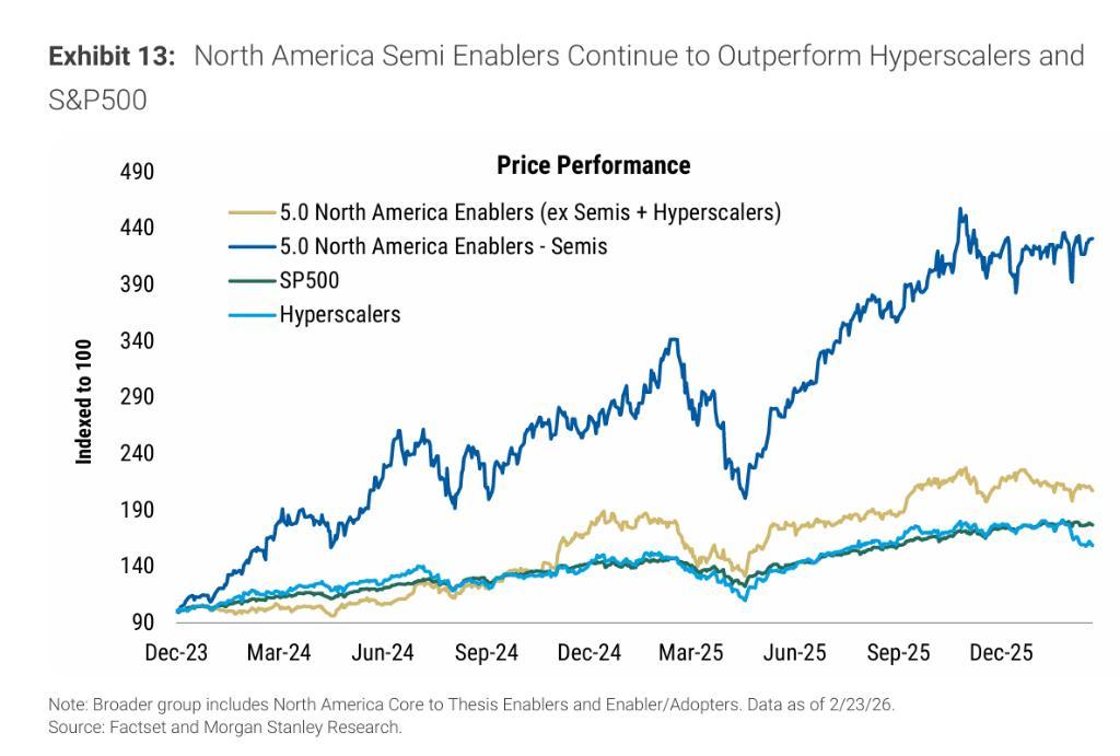 然而,資本支出的爆發式擴張並未帶來等量的收入上修。摩根士丹利指出,在過去六個月中,市場對2026至2027年資本支出的一致性預期累計上調超過6300億美元,但收入預期的修訂幅度遠爲有限,導致超大規模雲服務商的自由現金流(FCF)預期持續下行。反觀半導體AI賦能企業,過去兩年其2026年銷售收入一致性預期上調幅度約達60%,遠超超大規模雲服務商約8%的漲幅,成爲本輪AI投資週期中財務受益最爲直接的羣體。