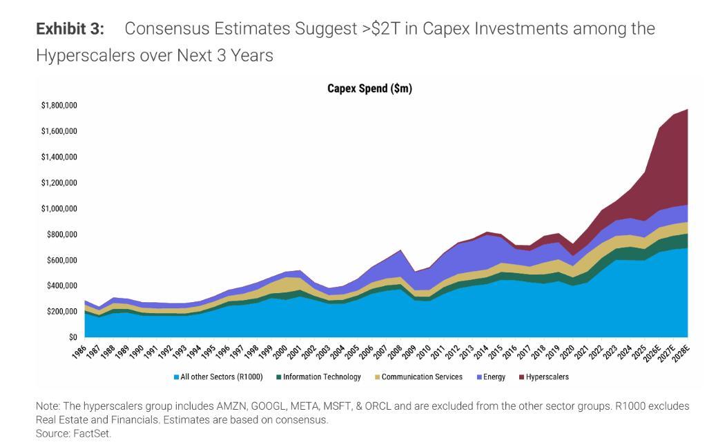 從對羅素1000指數的影響來看,2025年超大規模雲服務商貢獻了該指數資本支出增量的150%以上——意味着其餘成分股的資本支出實際上在淨收縮。超大規模雲服務商資本支出同比增長約70%,而指數其餘成分股則下降6%。摩根士丹利預計,至2026年,hyperscalers佔羅素1000總資本支出的比重將達約40%,較2024年翻番,並可能於2028年進一步躍升至49%。