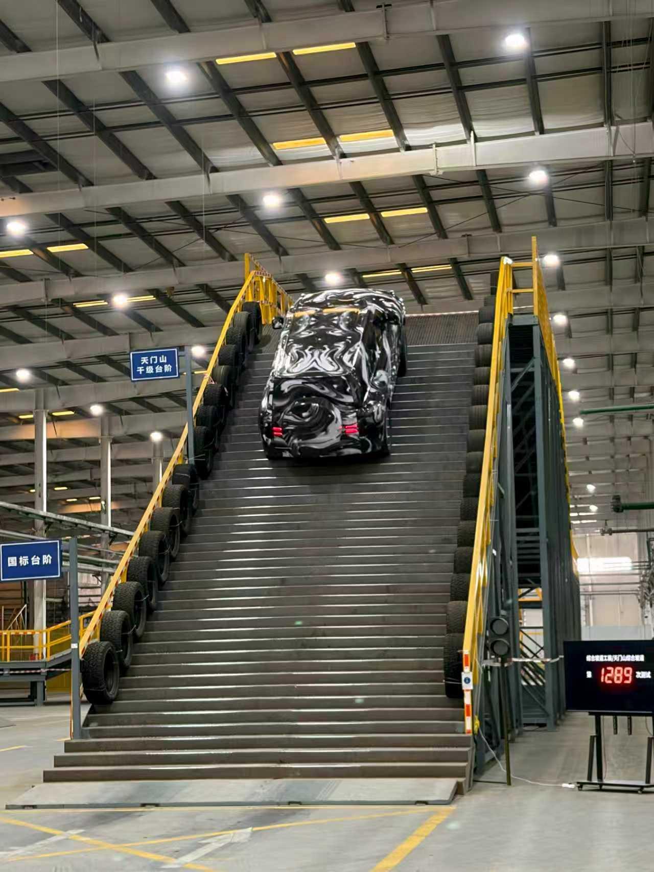 今日,一段神祕車輛測試路透視頻流出。視頻顯示一輛覆蓋僞裝膜的車型在模擬“天門山千級臺階”的測試場地完成爬坡,場地標識顯示臺階高度約 15-20 釐米,進深約 25-30 釐米,坡度超 35 度。視頻畫面中標註“第 1289 次測試”,該車型爬坡過程表現平穩。