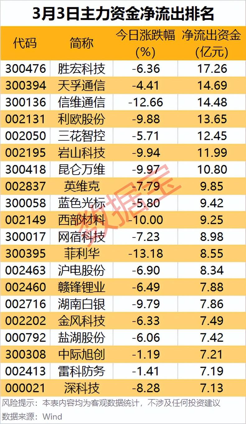 據證券時報·數據寶統計,今日(3月3日)滬深兩市主力資金淨流出1304.45億元,其中創業板淨流出504.24億元,滬深300成份股淨流出315.32億元。