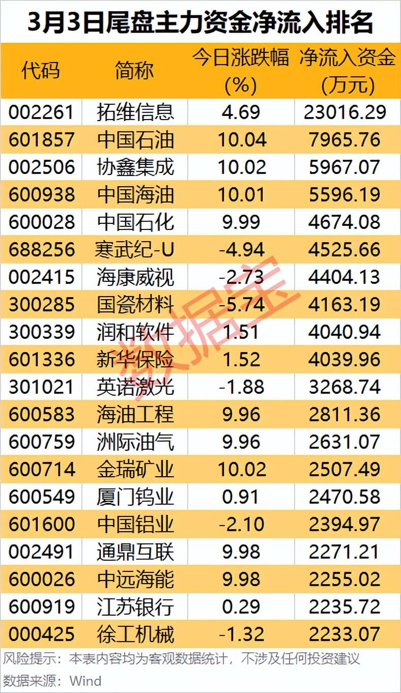 “三桶油”中國石油、中國海油、中國石化均漲停,尾盤主力資金淨流入均超4600萬元。