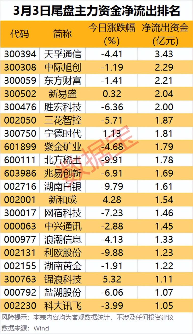 據數據寶統計,20股尾盤主力資金淨流出金額均超1億元。天孚通信尾盤淨流出金額達3.43億元,居首;中際旭創、東方財富、新易盛和勝宏科技尾盤主力資金淨流出金額均在2億元及以上。