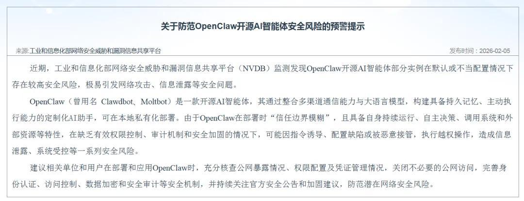 工業和信息化部網絡安全威脅和漏洞信息共享平臺發佈《關於防範OpenClaw開源AI智能體安全風險的預警提示