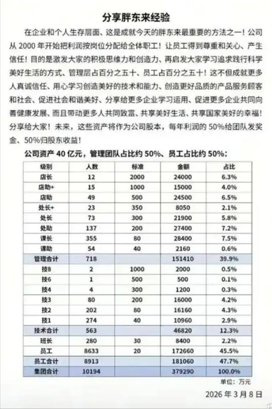12個店長分2.4億,平均每個店長2000萬,每個人從打工人變成了企業合作伙伴。每個店長都會爲自己的千萬資產去精益求精,變着法的去提高銷售、優化管理。一家企業賺到的錢,是真的可以讓所有員工都過上舒適的生活的,這已經不是年終獎了,這是勞動者的剩餘價值迴歸!