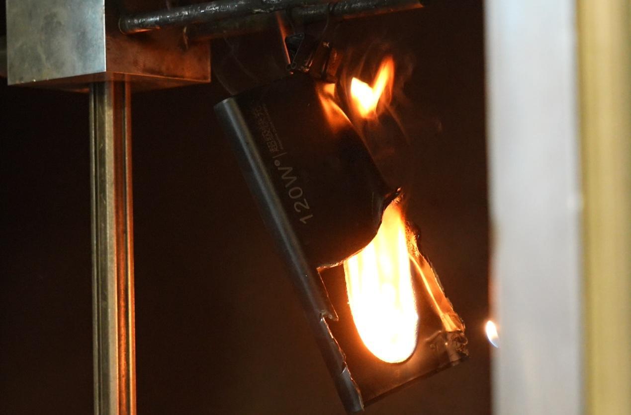 實驗室工作人員:火焰應該在30秒內熄滅纔算通過,按照要求外殼不能燃盡。而且還有滴落物。