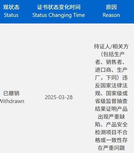 消費者王先生花69元在另一個電商平臺上買了一款“科諾克”牌充電寶,他查詢3C認證信息發現,該產品是2025年7月15日生產的,但其生產商科訊騰科技有限公司3C認證早在2025年3月28日已被撤銷。王先生向平臺反映後雖然拿到了退款,但截至發稿,相關產品依舊在銷售。