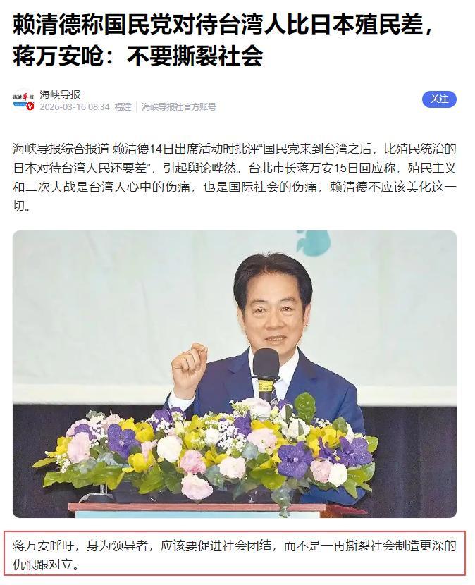 賴清德在3月14日的公開活動中,公然發表美化日本殖民統治的離譜言論,顛倒黑白抹黑歷史,這話一出,臺北市長蔣萬安第一時間站出來嚴厲痛批,島內各界也是罵聲一片。