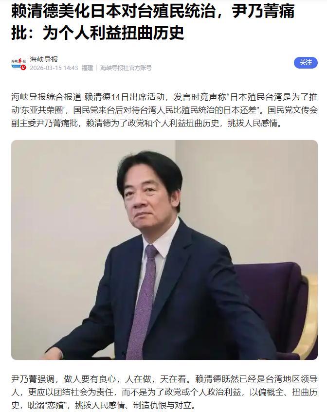 根據海峽導報綜合報道,賴清德在3月14日的公開活動發言中,聲稱日本殖民臺灣是爲了推動東亞共榮圈,還說國民黨到臺灣之後,對待臺灣民衆比日本殖民統治還要差。