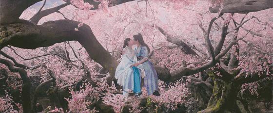 比如《與晉長安》中有一個畫面:粉色花瓣漫天飛舞,男女主坐在桃樹上對視告白,風一吹,衣袂輕揚,時間彷彿被拉長。畫面當然動人,但很難讓人相信,這是一位常年征戰的將軍的生活。