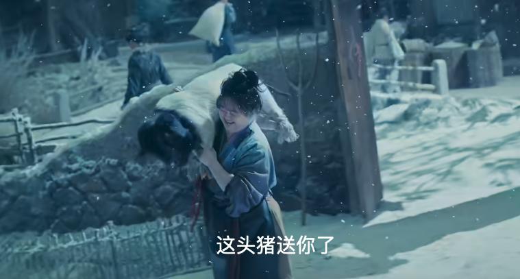 隨後,女主畫着精緻全妝出鏡,眉頭輕輕一皺,就輕鬆扛起那隻年豬進了屋子。