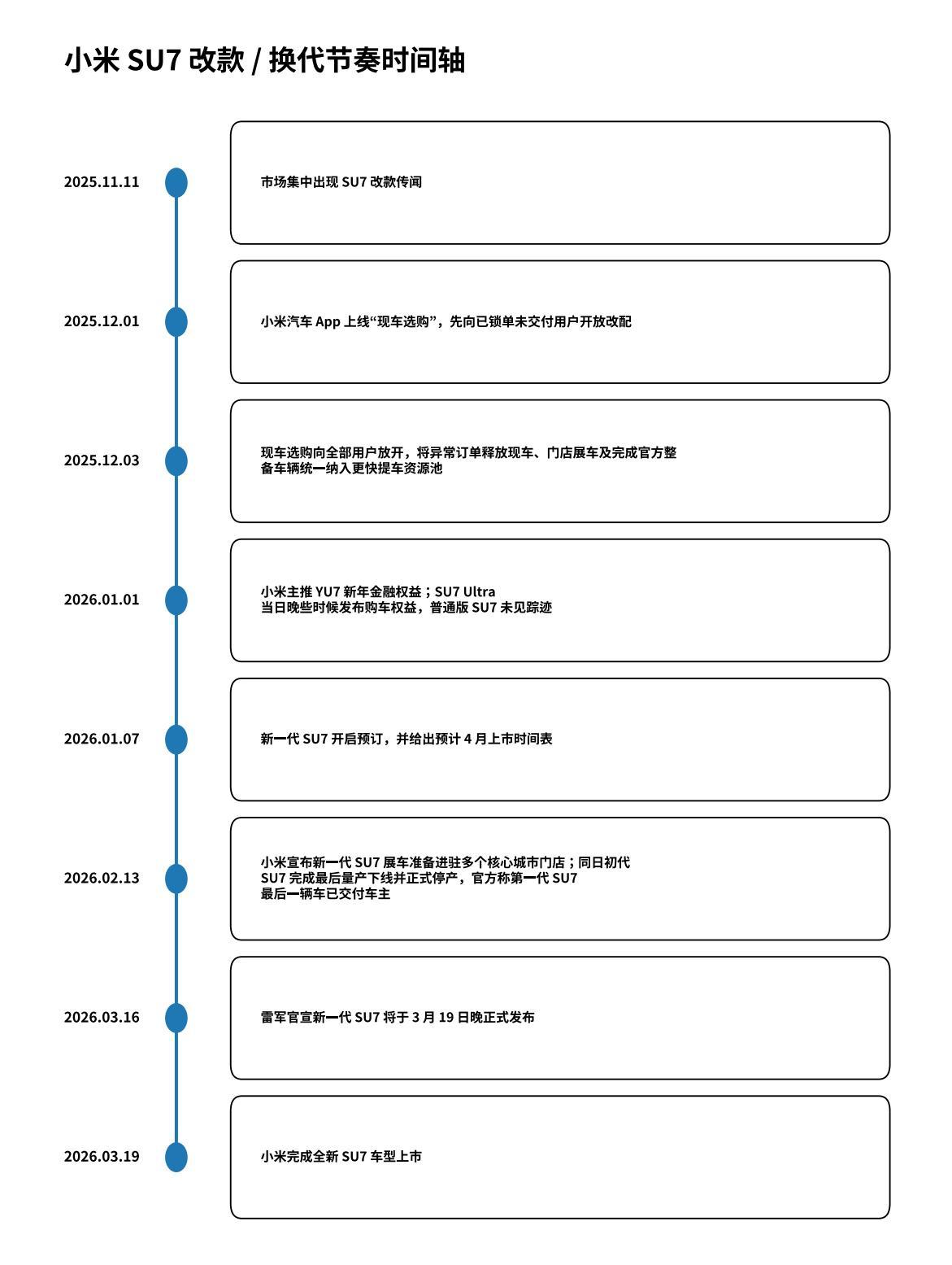 時間線上看,自2025年11月11日市場集中出現SU7改款傳聞起,到2026年3月19日晚新一代SU7正式發佈,小米爲這次中改切換準備了128天。不同於傳統車企更常見的切換方式,這家公司在4個月內並未將舊款清尾、新款預熱和現車拆解成彼此割裂的動作,節奏清晰而連貫。