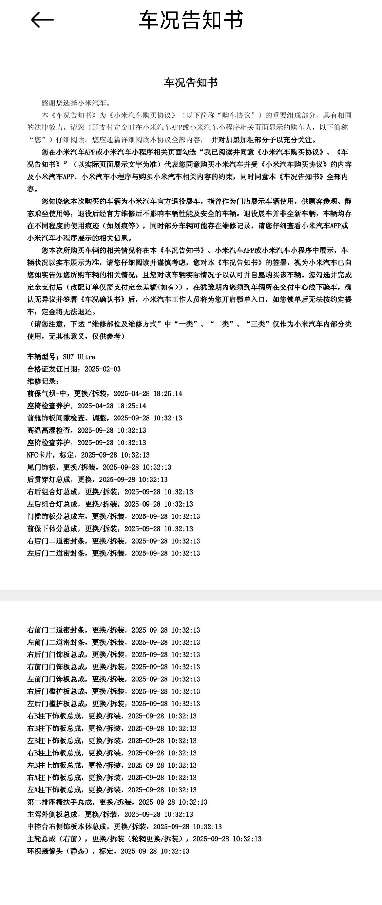 一份SU7 Ultra現車《車況告知書》截圖裏,維修記錄甚至被逐項公示到飾板、燈組和密封條層級。這當然有助於營造“誠實”的信用標籤,但也同時意味着,一旦熱度回落或創始人背書減弱,該動作隨時可能反過來成爲輿論壓力的入口。