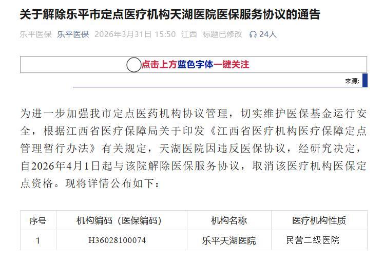 2026年4月1日,當西方的愚人節玩笑還在網絡上流傳時,江西樂平的醫療圈卻迎來了一場真實的“寒冬”。一家運營十一載、曾被譽爲當地醫療重要補充的二級甲等綜合醫院——天湖醫院,在這一天按下了“停止鍵”。一紙冰冷的通知,宣告了全體職工勞動合同的解除,數百名醫護人員一夜之間失去了奮鬥的戰場。這並非節日的惡作劇,而是一場因醫保紅線引發的生存危機。