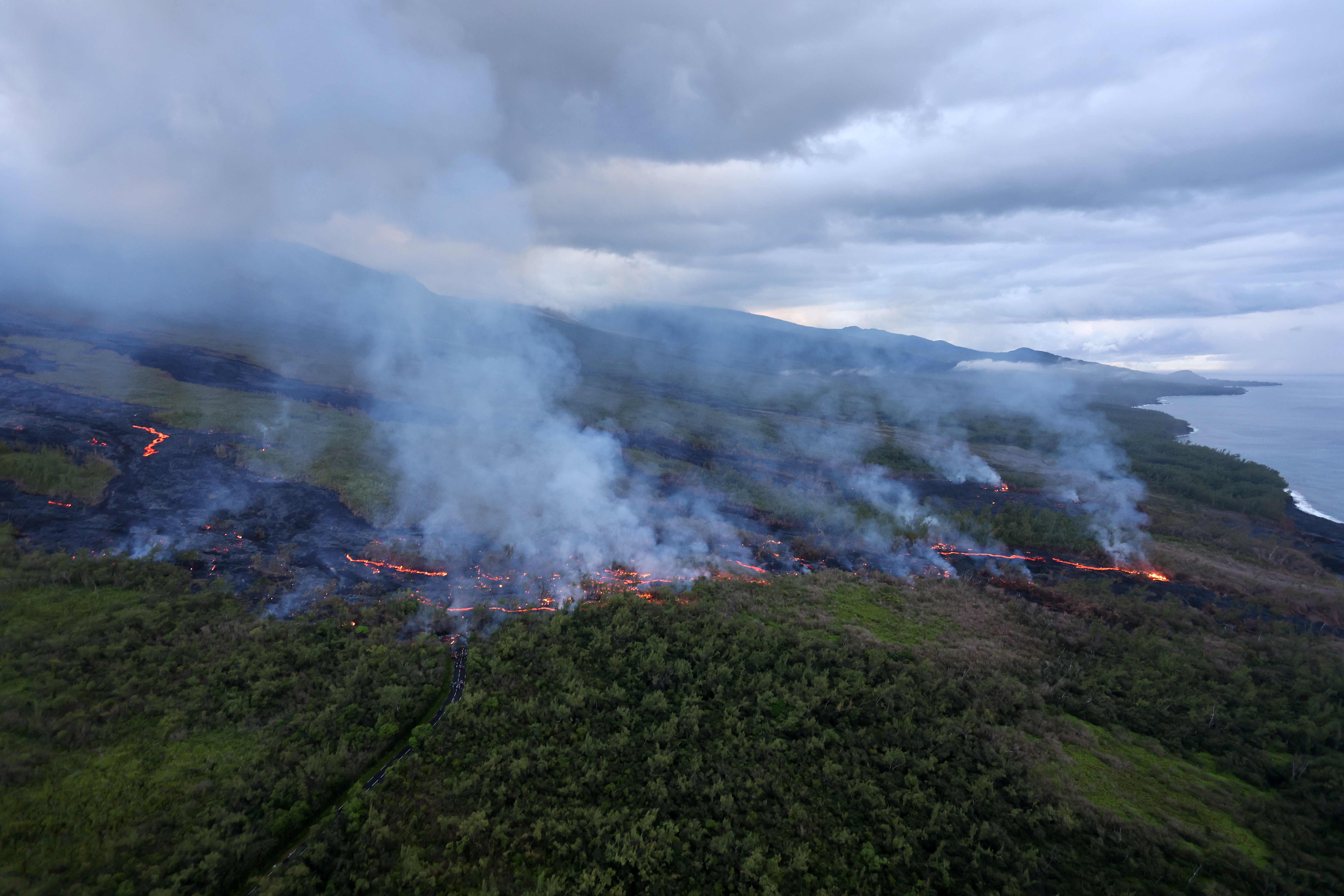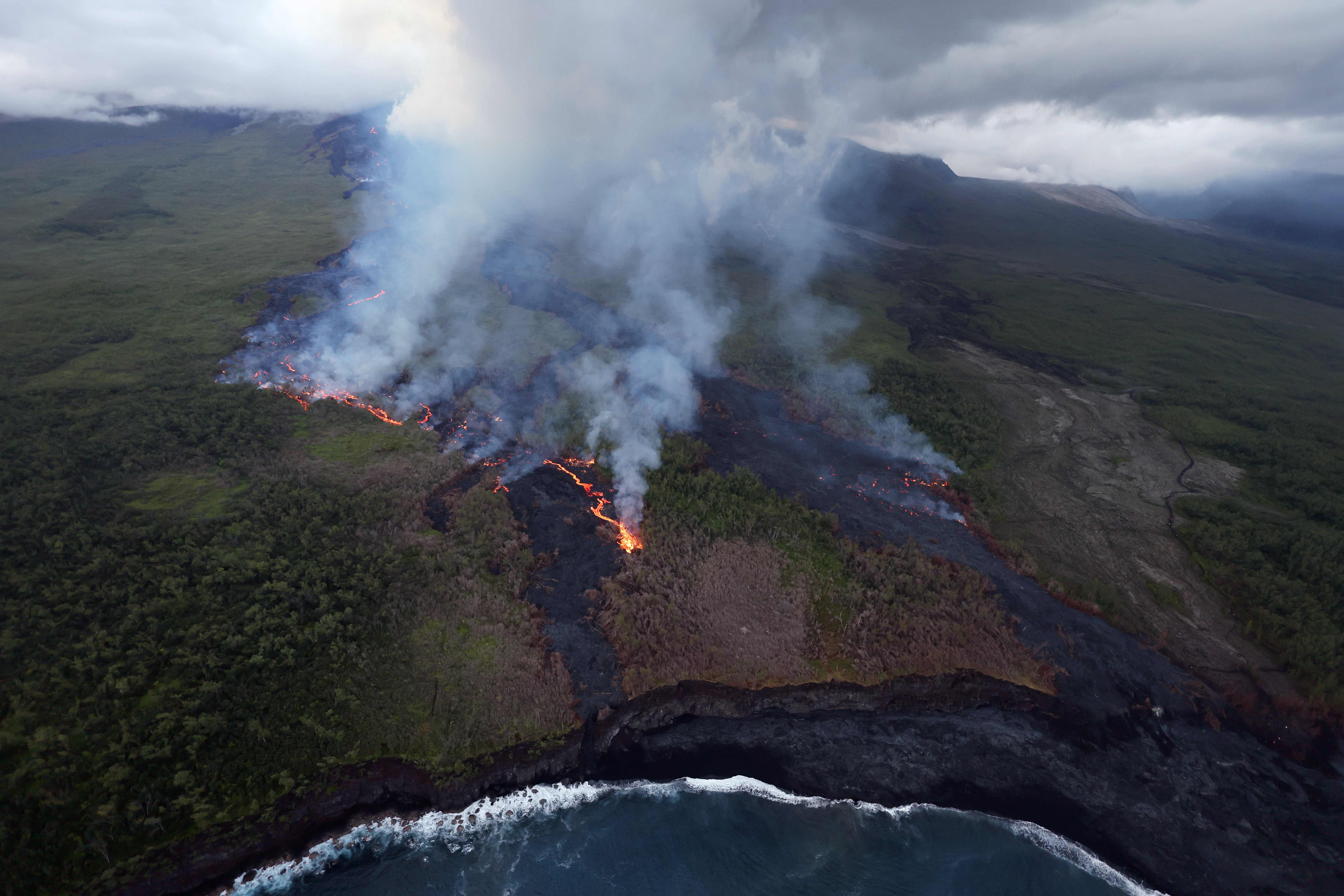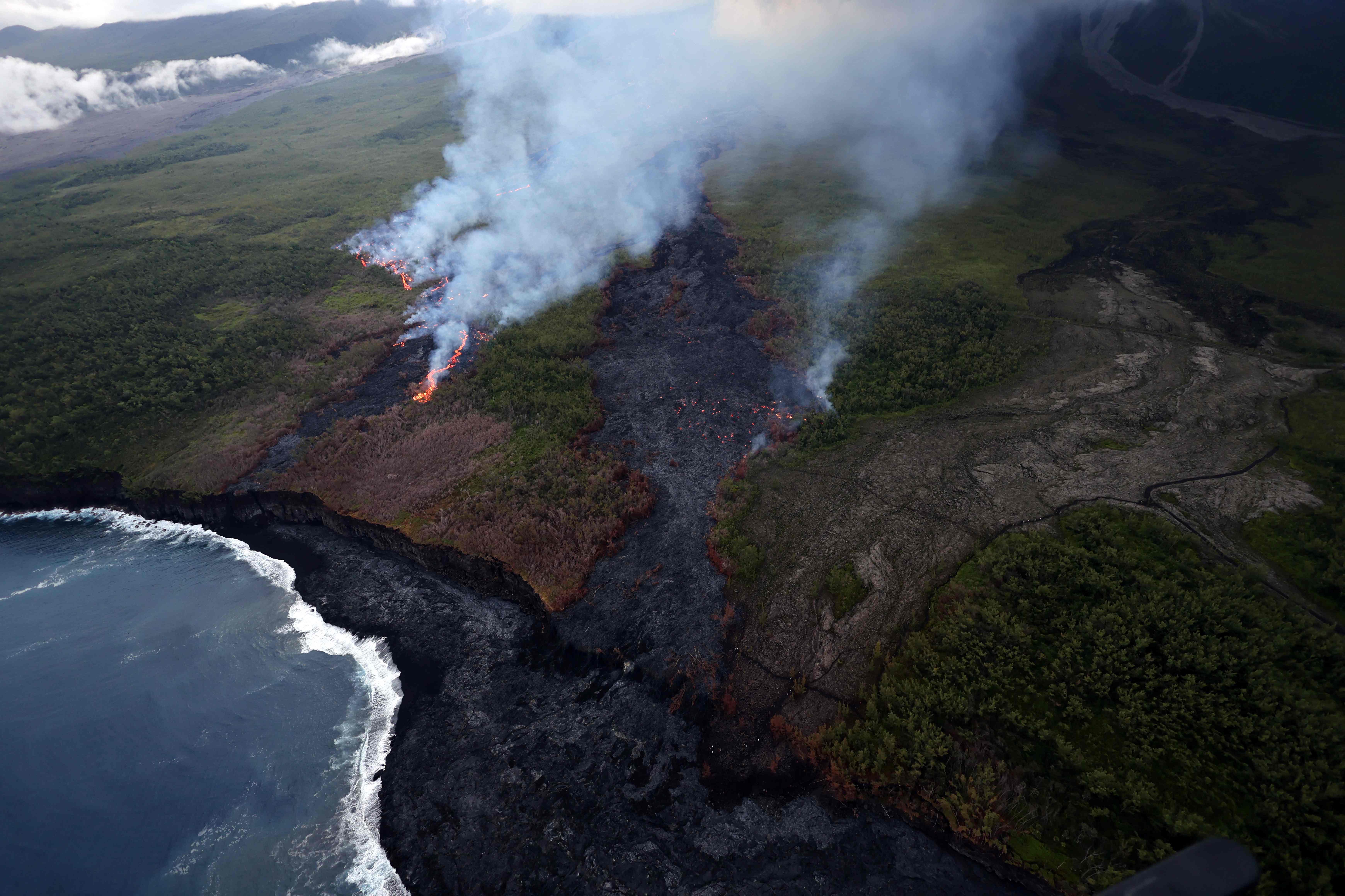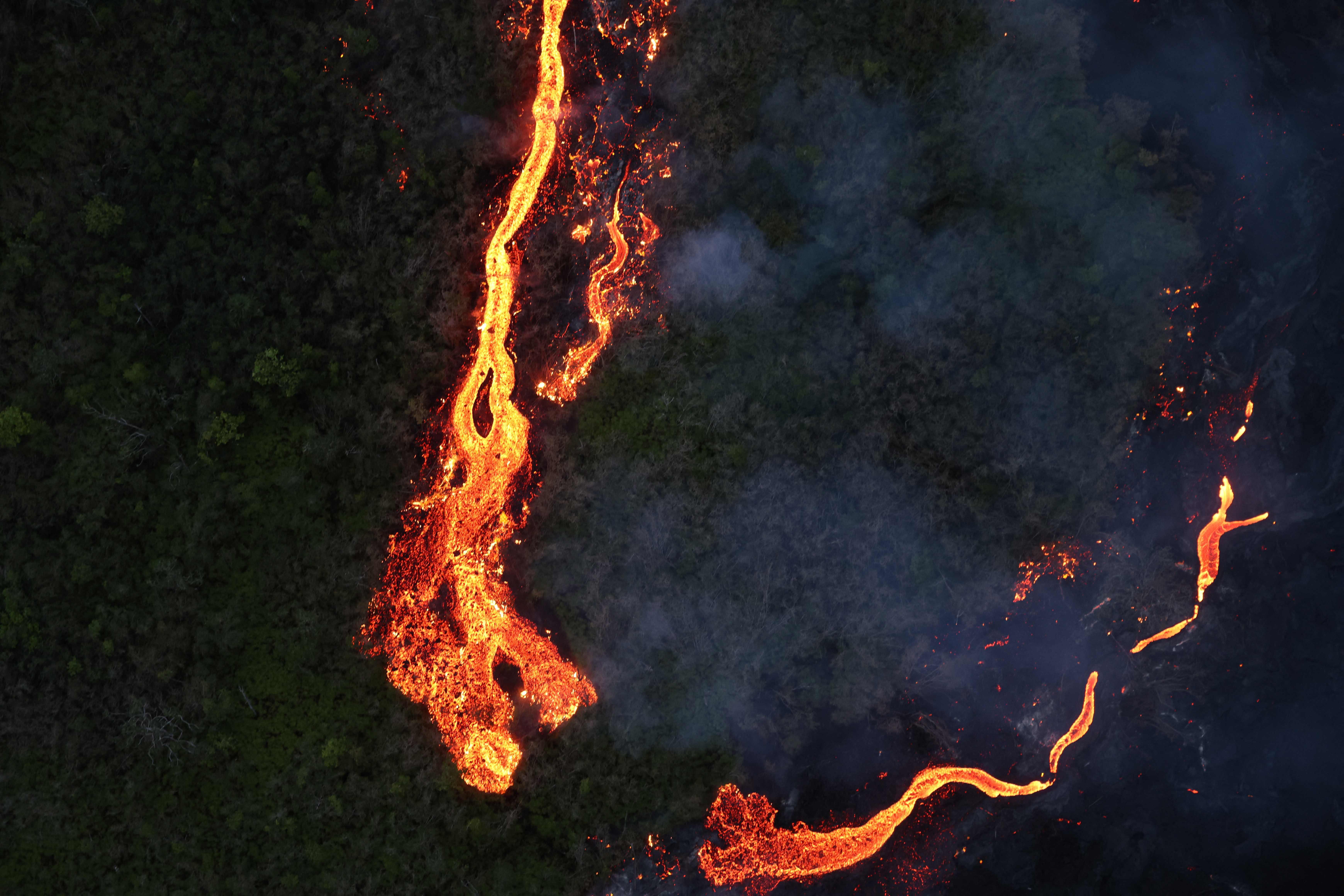 這是4月2日在法屬留尼汪島航拍的富爾奈斯火山噴發出的岩漿。新華社/法新