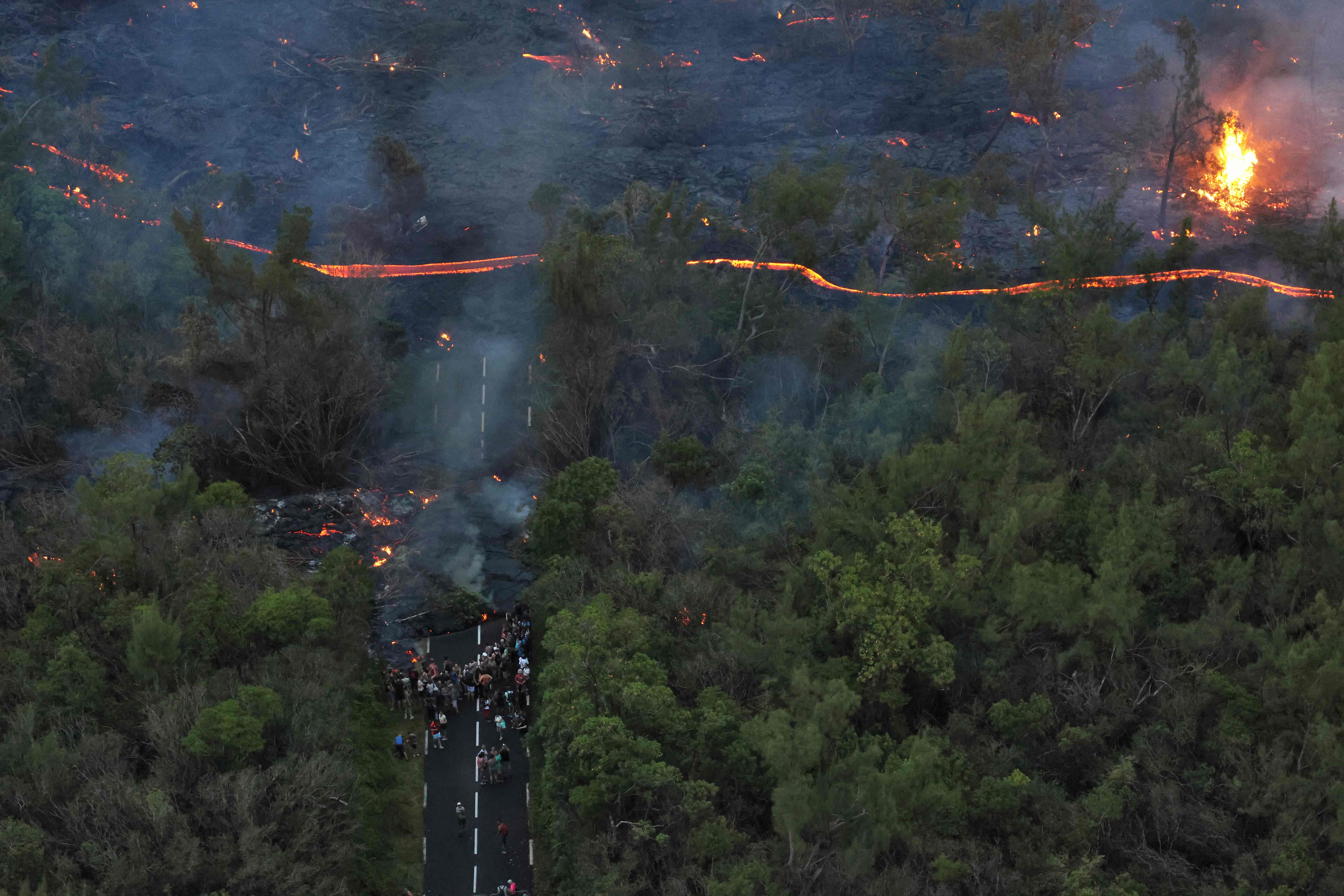4月2日,在法屬留尼汪島,人們近距離觀察富爾奈斯火山噴發出的岩漿。新華社/法新