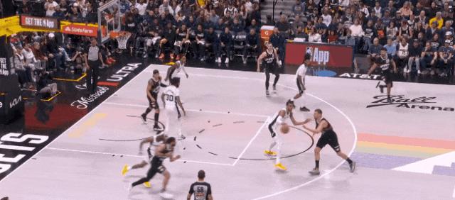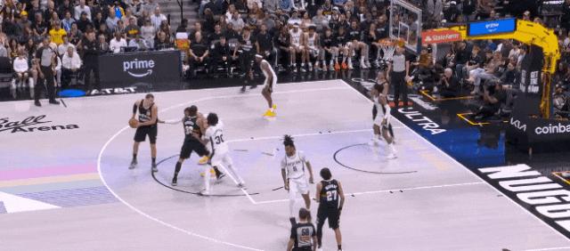 開場約基奇曾靠肩臂推開過文班背喫得手。下半場他不去禁區背喫了,但肩臂還能用嘛——弧頂接球,順勢左手推開文班,拋射:文班出禁區,馬刺禁區沒人了。