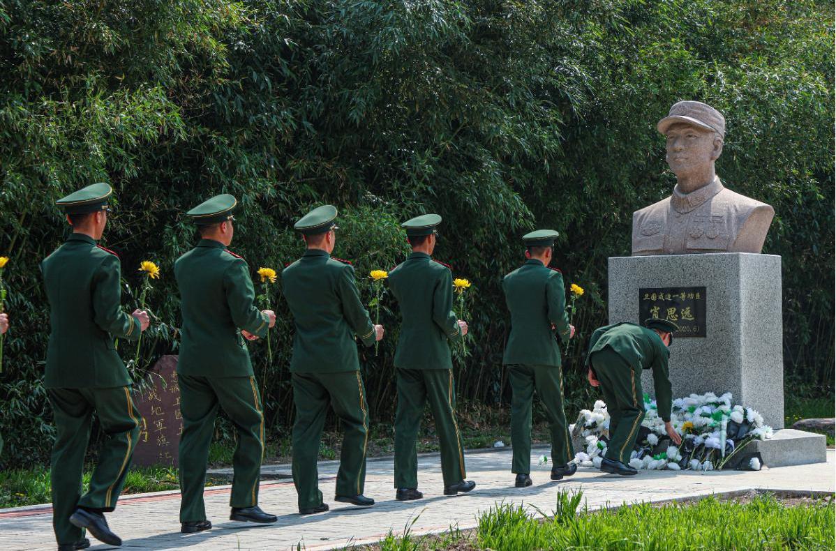 ↑武警河南總隊新鄉支隊官兵向新時代衛國戍邊英雄肖思遠塑像敬獻鮮花