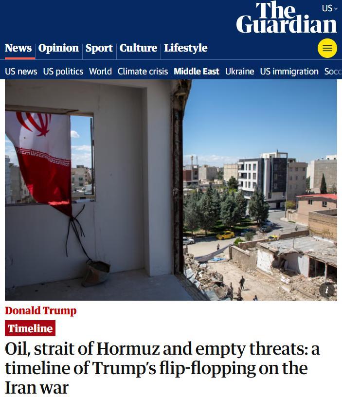 英國《衛報》4日的報道也總結了美國在對伊朗軍事行動上,涉及奪取石油、霍爾木茲海峽和對伊威脅等各類出爾反爾的情況。
