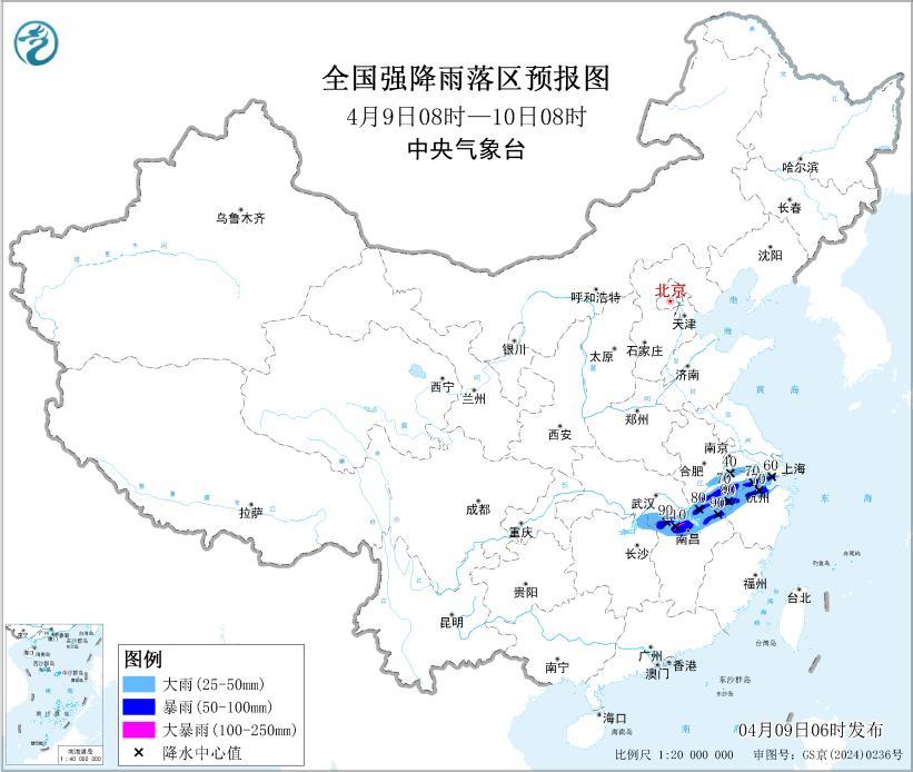 預計,4月9日8時至10日8時,安徽南部、江蘇南部、湖北東南部、湖南東北部、江西北部、浙江北部等地部分地區有大雨,其中,安徽南部、江西北部、浙江北部等地部分地區有暴雨,局地大暴雨(100~110毫米)。上述部分地區伴有短時強降水(最大小時降雨量20~40毫米,局地可超過50毫米),局地有雷暴大風或冰雹等強對流天氣。