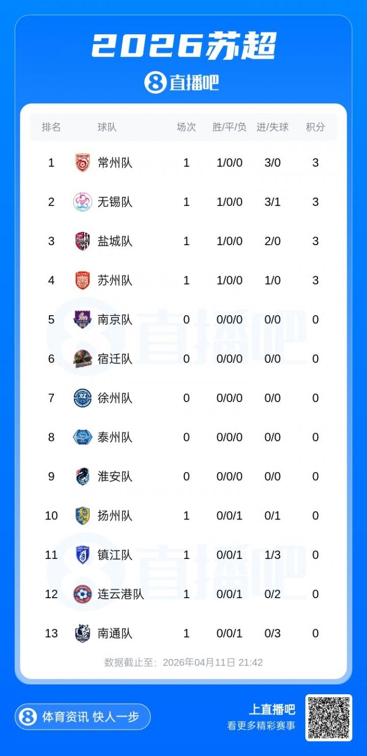 04月11日訊 蘇超第1輪,上賽季被調侃爲“太湖三傻”的蘇州隊、無錫隊和常州隊,進化爲“太湖三寶”,全部獲勝。