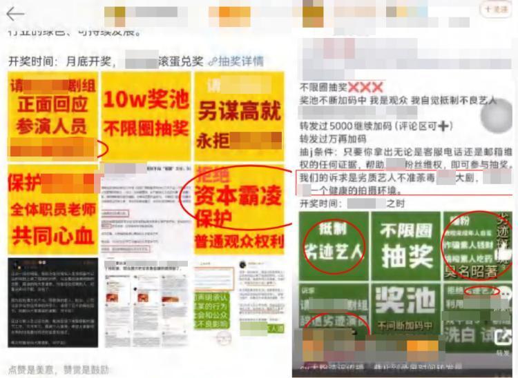 北京市第四中級人民法院法官助理趙赫介紹:“一審被告在相關微博中,說原告是‘劣跡藝人’‘臭名昭著’,併發布包含‘詐騙素人錢財’‘挑唆素人喫藥’等內容的圖片信息。同時,圍繞針對原告的特定話題發佈‘不限圈抽獎’,明確‘轉發過5000繼續加碼’,聲稱抽獎條件是,只要網友拿出無論是客服電話還有郵箱維權的任何證據,幫助被告的偶像演員粉絲維權,即可參與抽獎。”