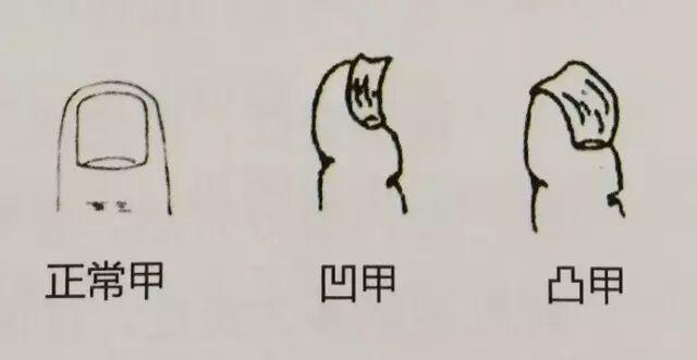 凹甲,甲面中央凹下低於四周,甲面上有凹點和縱行細微的條溝,甲下色不均勻。多提示肝腎功能不佳,易於疲勞,精力不充沛,也易患不孕不育症。