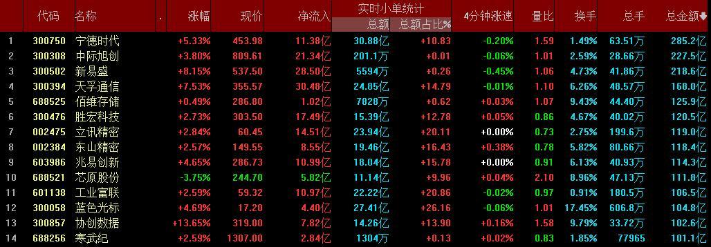 值得注意的是,今日有14只個股成交額超100億元,其中有13只爲 AI算力賽道龍頭股;寧德時代成交額居首,爲動力電池龍頭。