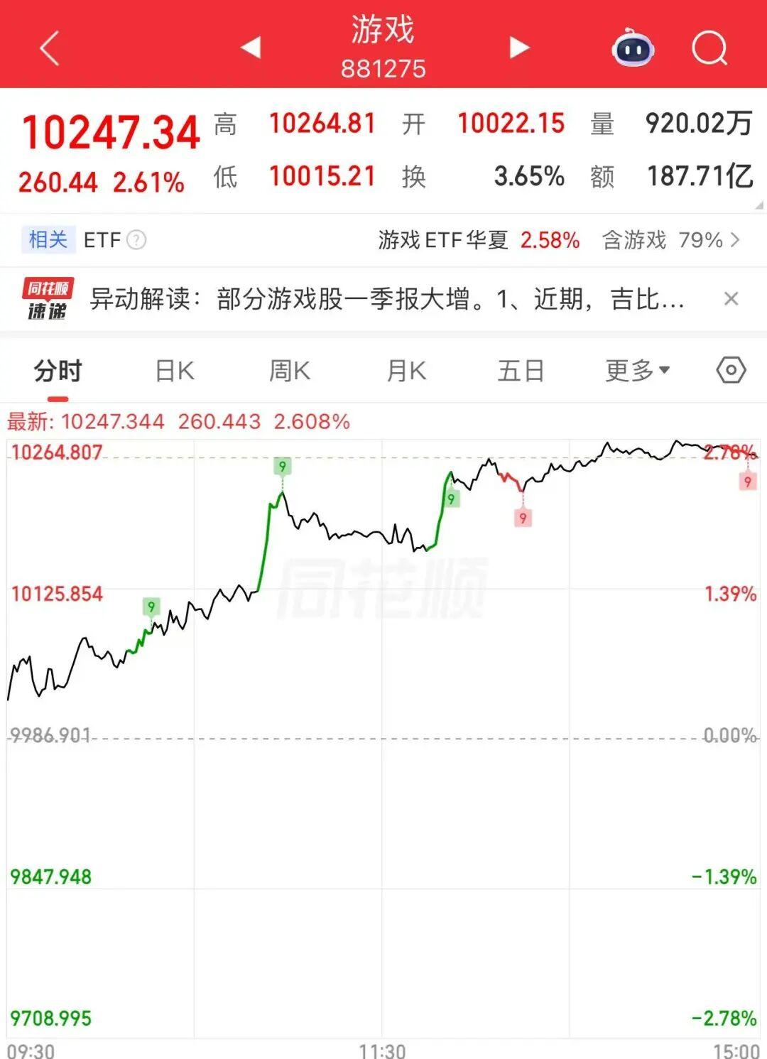 今日午後,遊戲板塊拉昇走強,完美世界盤中觸及漲停,迅遊科技、中青寶漲超5%,巨人網絡、世紀華通等跟漲。
