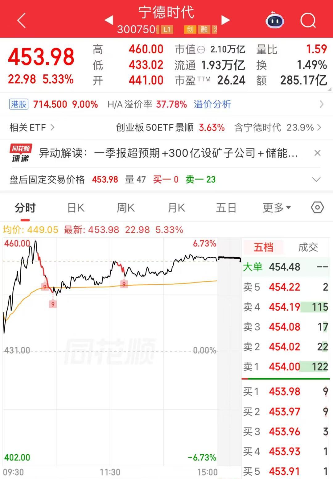 受一季報超預期表現以及擬投資設立全資子公司等消息影響,寧德時代股價今日大漲5.33%, 報453.98元/股, 盤中最高觸及460元/股, 創歷史新高,最新市值達到2.1萬億元,全天成交額285.17億元,居A股第一名。