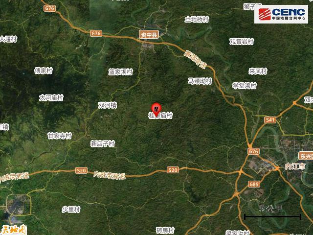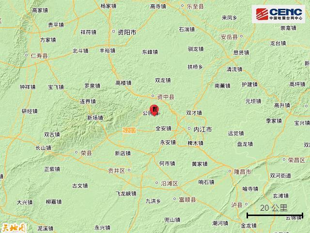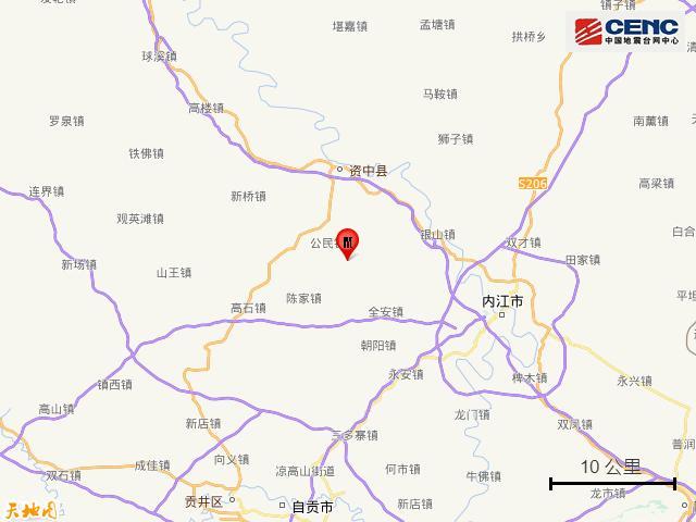據中國地震臺網正式測定,4月17日6時22分在四川內江市資中縣發生4.4級地震,震源深度7公里,震中位於北緯29.65度,東經104.86度。