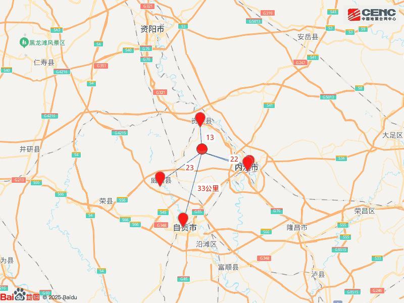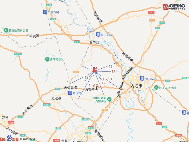 震中距資中縣13公里、距市中區21公里、距東興區22公里、距威遠縣23公里、距大安區33公里,距內江市21公里,距成都市135公里。