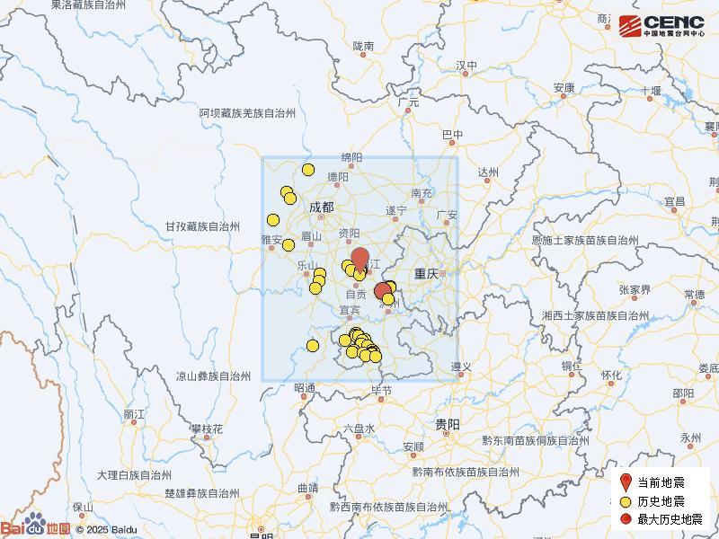 根據中國地震臺網速報目錄,震中周邊200公里內近5年來發生3級以上地震共212次,最大地震是2021年9月16日在四川瀘州市瀘縣發生的6.0級地震(距離本次震中68公里),按震級大小前50次歷史地震分佈如圖。