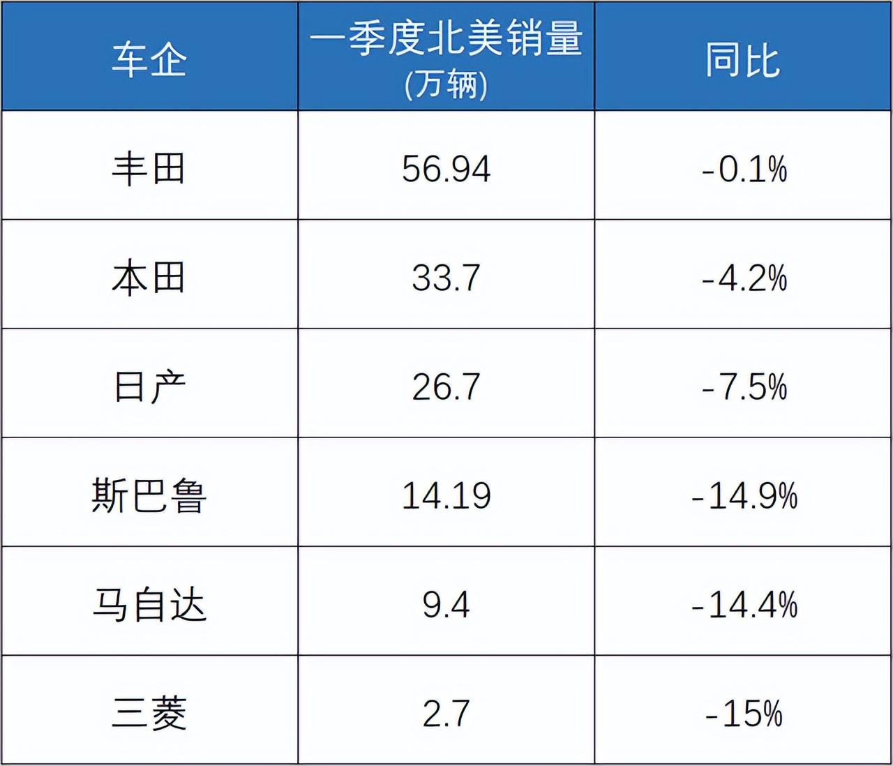 斯巴魯一季度銷量14.19萬輛,暴跌14.9%,連續8個月銷量下滑,3月單月跌幅高達24%;馬自達連續4個季度下滑,3月跌幅26%;三菱一季度銷量僅26884輛,下滑15%,幾乎退出主流市場競爭。