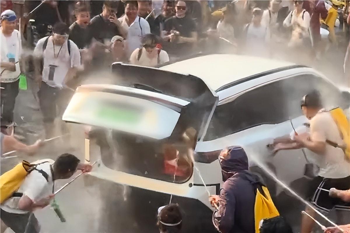 現場目擊者稱,車輛行駛中,多名圍觀羣衆圍了上來,一邊向車輛潑水,一邊反覆拉扯車門,還有人趁機打開了車輛尾門,對着車內不斷灌水。