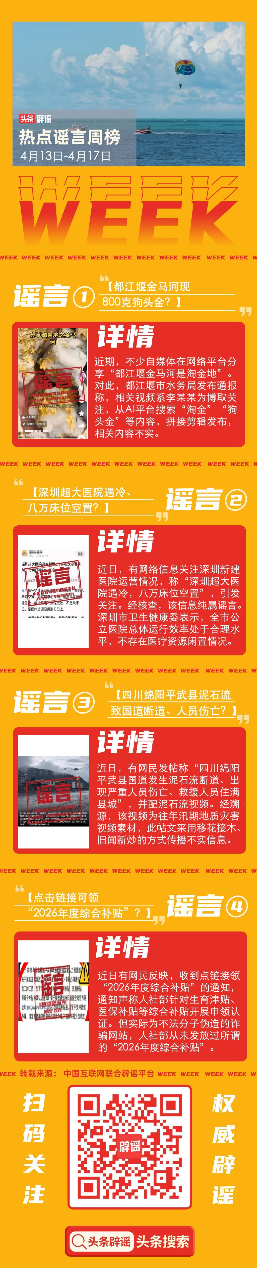 此外,本週還有“深圳超大醫院8萬張牀位空置”、“四川綿陽平武縣發生泥石流致國道斷道、人員傷亡”等不實消息流傳。