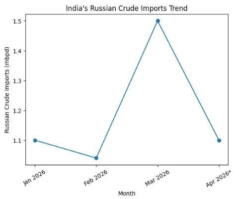 《印度快報》4月16日報道,美國終止俄伊原油在途豁免,印度對俄石油進口或短期承壓但結構依賴難改。美國財政部長斯科特·貝森特宣佈,針對已在途俄羅斯原油的制裁豁免已於4月11日到期且不再延長,對伊朗石油的類似安排也將於4月19日終止。該臨時措施原用於緩解中東衝突衝擊霍爾木茲海峽航運所引發的全球石油供應緊張。受豁免推動,印3月自俄原油進口量躍升至約200萬桶/日,佔比達44.4%,4月前兩週仍維持約160萬桶/日,而此前2月自俄進口量一度降至約100萬桶/日。隨着豁免到期,印對俄採購或面臨操作性收縮,如規避受制裁主體、轉向中間商交易,但大幅削減可能性有限。印度是全球第三大原油消費國,其原油進口依賴度超過88%。在中東供應不穩、替代來源有限背景下,俄原油憑藉價格優勢及繞開霍爾木茲海峽的物流穩定性,仍將維持其在印度進口結構中的主導地位。