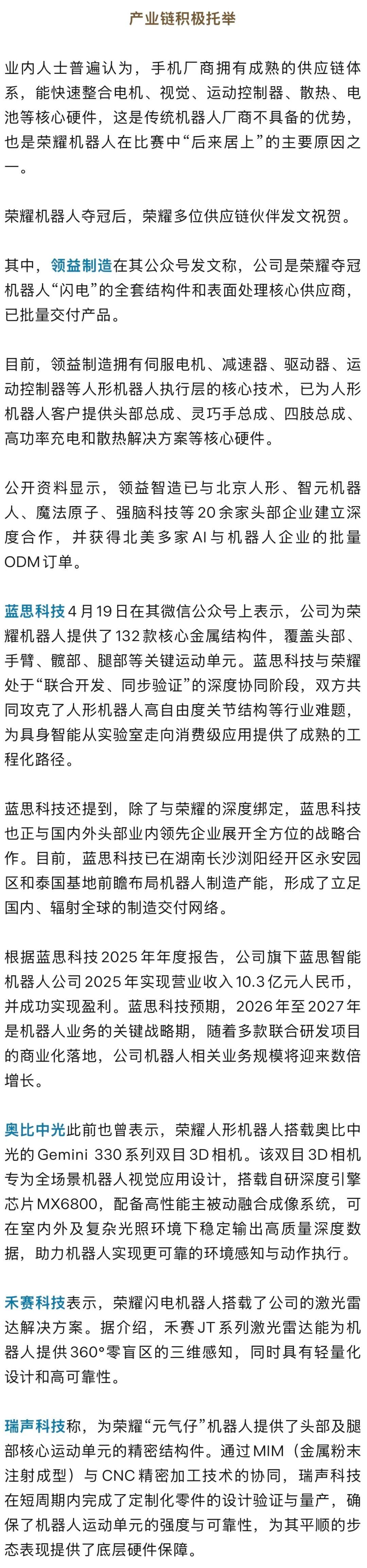 從2025年成立新產業孵化部門佈局人形機器人領域,到2026年旗下人形機器人“閃電”在“半馬”賽事中奪冠,榮耀僅用了一年多時間。這一成績的背後,除了榮耀長期積累的技術實力,更離不開成熟的消費電子產業鏈作爲堅實支撐。