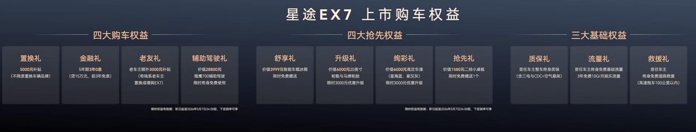 [懂車帝原創 產品] 4月19日,星途汽車旗下全新中大型SUV——星途EX7正式上市,共推出純電和增程兩種動力版本的六款車型,指導價19.99萬-26.39萬元,搶先置換價19.49萬-25.89萬元。新車採用家族最新設計語言,全系標配獵鷹700輔助駕駛系統以及全新AI靈犀智艙2.0,並且提供EMB線控制動系統和飛魚底盤3.0等技術。