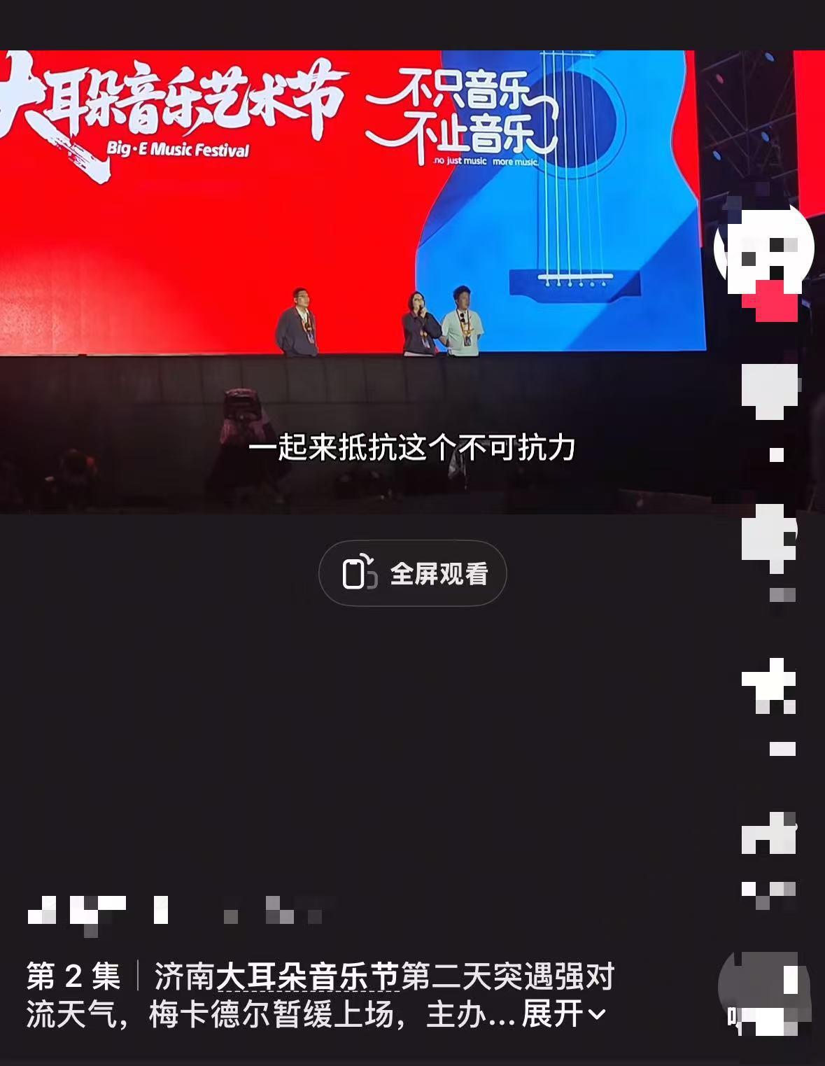 另外,極目新聞記者發現,19日晚,有山東網友發視頻稱:“濟南大耳朵音樂節突遇強對流天氣,有樂隊暫緩上場,主辦方上臺發言。”現場視頻顯示,活動主辦方上臺向觀衆說明情況,稱因天氣原因有樂隊需暫緩上場,並表示:“希望你們和我一起抵抗不可抗力,我們等風過去,如期再繼續演。”20日,多位到場觀衆告訴記者,演出中途暫停了一會兒,後續恢復正常進行。