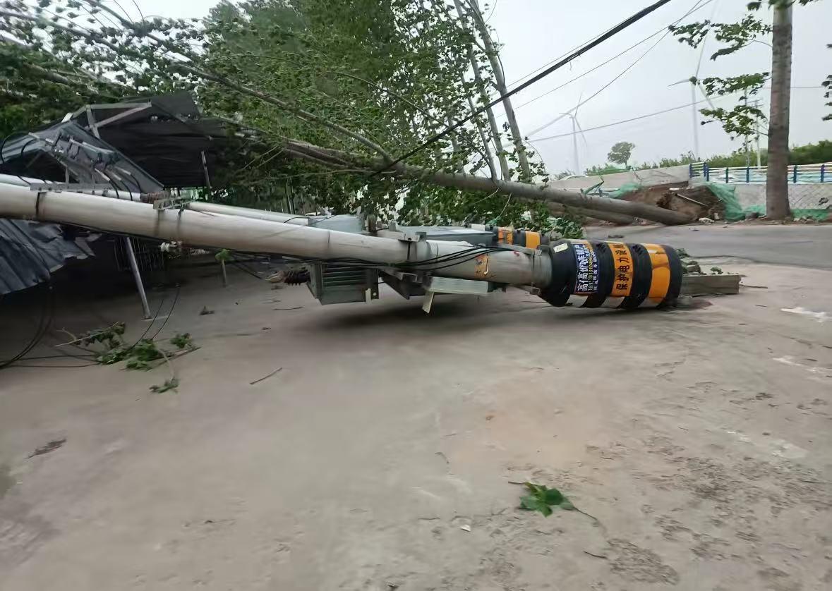 19日,河北一網友發佈的視頻顯示,在邯鄲市魏縣魏城鎮東南溫村,一處電線杆完全斷裂倒塌,旁邊也有幾棵樹傾倒在地,樹幹橫臥在路面上。畫面中,一處雨棚被樹砸壞。
