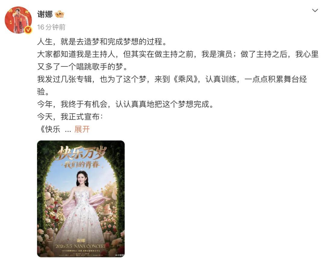 謝娜在乘風舞臺正式宣佈,2026謝娜演唱會,5月5日成都,將帶着專輯歌曲和十首唱跳舞臺,百分百誠意回饋大家,期待與多年老友和觀衆們重逢。她說她一直懷揣着歌手與舞臺夢想,發專輯、來乘風、練習唱跳。