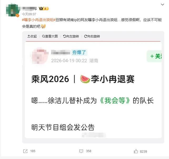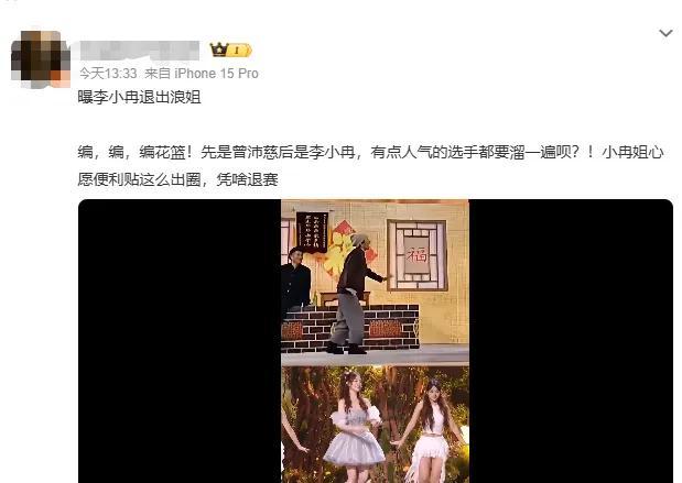 4月19日,有多位網友在社交平臺發文:“曝李小冉退出浪姐”。